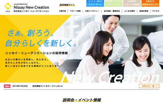 株式会社ニッセイ・ニュークリエーションのサイトをご覧いただき、ありがとうございます。 本日、採用情報サイトをリリースいたしましたのでお知らせします。 今回のリニューアルでは、ご利用者のみなさまがより見やすく、より快適にご利用できるホームページを目指し、デザイン・構成を一新し、さらにスマートフォン端末でも閲覧できるようになりました。 今後もコンテンツの充実および分かりやすい情報の発信に努めてまいります。引き続きよろしくお願い申し上げます。